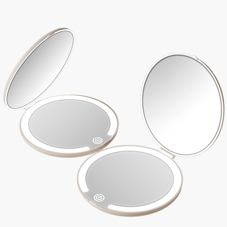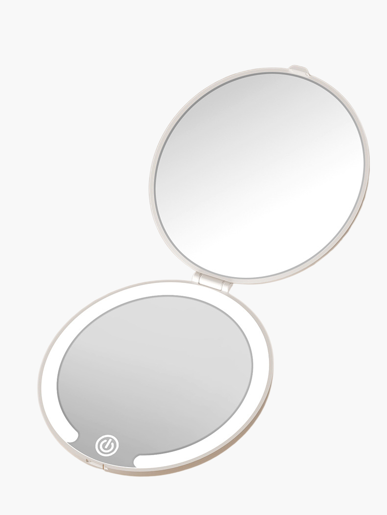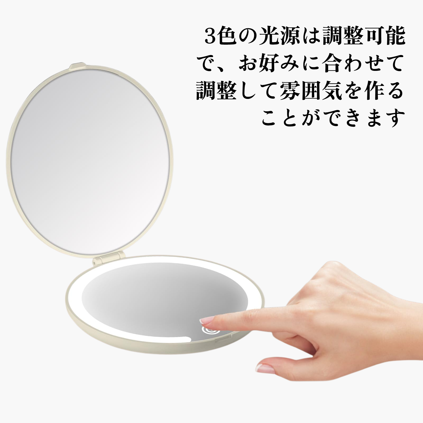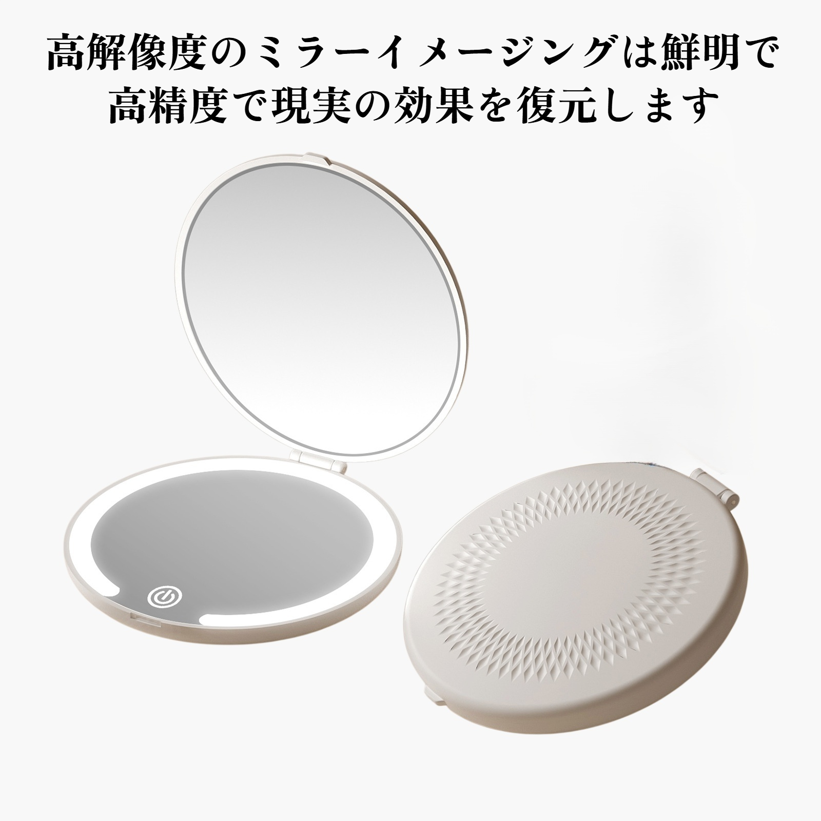 明るさ調整可能なLEDライト搭載、折りたたみ式で持ち運び便利。高精細ミラーでメイクやスキンケアに最適。